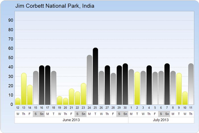 Jim Corbett National Park has a temperate climate. Like the rest of India, Corbet also experiences the three distinct seasons, namely summer, winter and monsoon. The rare species of wildlife, which finds refuge in the wildlife reserve, is well-adapted to these seasonal variations and temperature. For the convenience of both the animals as well as the tourists, the park remains open between the months of November and June, which agreeably is the best time to visit the park. However, to prepare yourself for the expedition, it is necessary to know the weather and climatic conditions of the place.